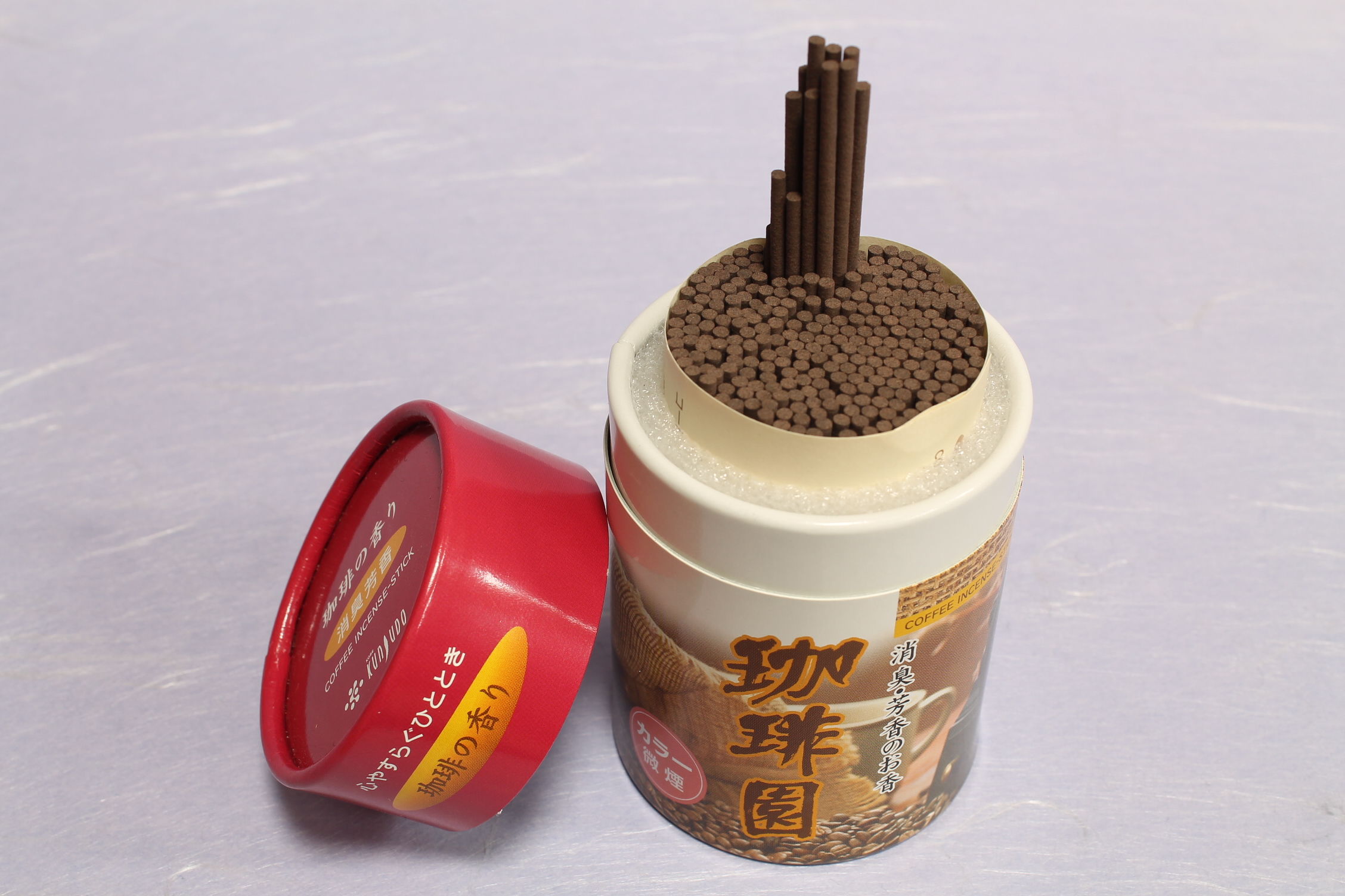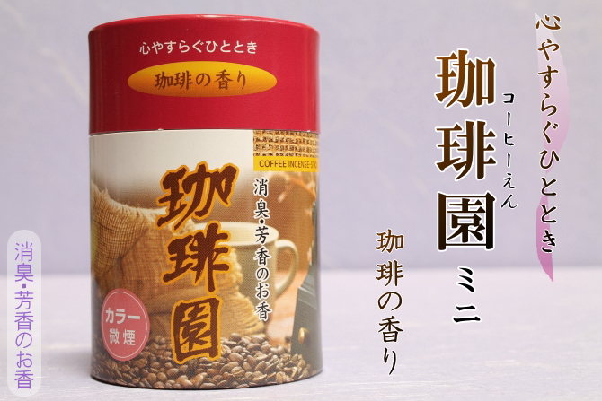 「珈琲園」は気になるニオイを消臭、煙の少ない「カラー微煙」タイプのお香です。天然消臭成分フラボノイド配合で、お香を置くだけで嫌な臭いを消し去り、お香に火をつければ、消臭効果とともにコーヒーの芳ばしい香りが広がります。