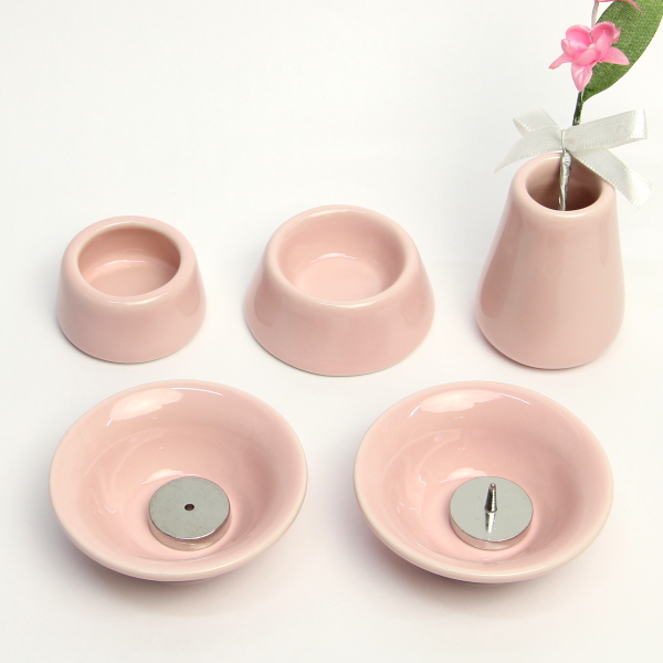 亡くなったペットのための小さな仏具セットです。供物皿・水入れ・花立・造花・燭台皿・香皿、ローソク立・香立の8点セット。ピンク・グリーン・ホワイトの3色がございます。